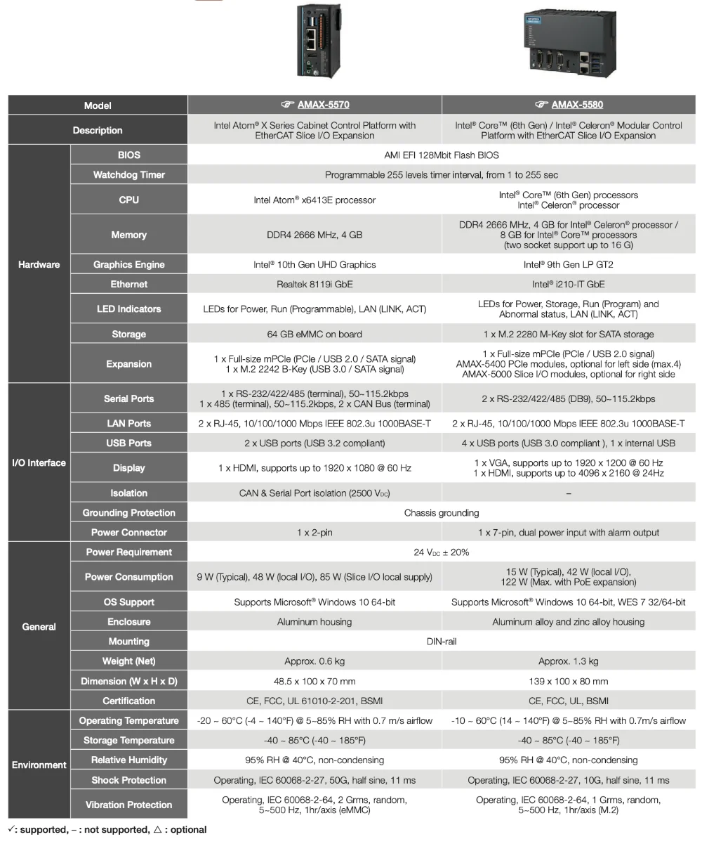 AMAX-5570 is specially designed for machine and equipment builders, with efficient Intel Atom® 4 core CPU series processors and optimized local expansion slots for general IT and OT applications. On board, the eMMC storage design minimizes the overall size and allows scalable local expansion with mPCIE and M.2 B key ports for further storage or wireless communication requirements. Extra Wi-Fi or cellular modules can be installed for uploading data to cloud servers.
